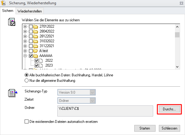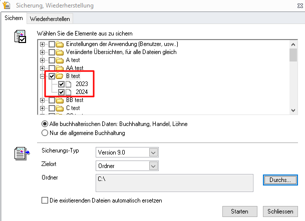2. Wählen Sie den/die Buchhaltungsordner und das/die Jahr(e), die Sie sichern möchten.