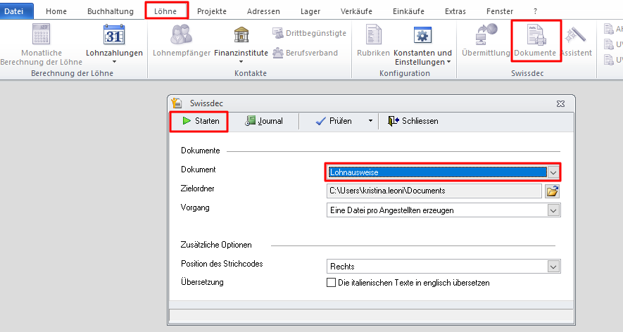 Vergewissern Sie sich, dass das erzeugte "Dokumente" "Lohnausweise" ist, bevor Sie den Druck starten.