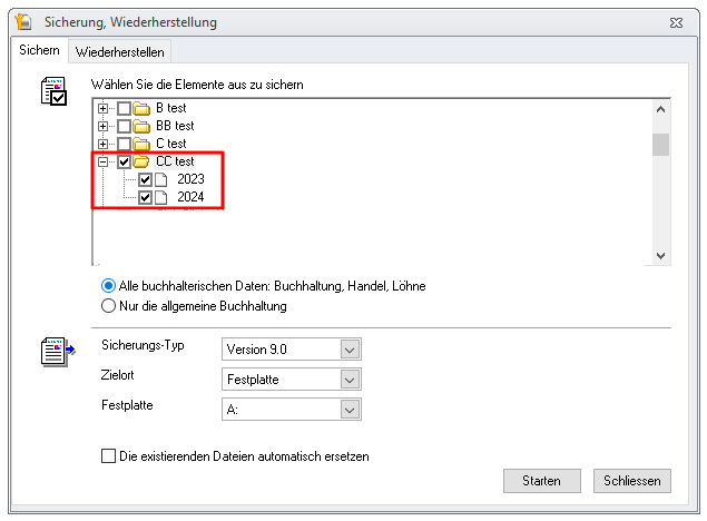 Wählen Sie alle Buchungsordner sowie die Einstellungen der Anwendung (Liste der Buchungsordner, der Geschäftsjahre und der Benutzer) sowie die veränderten Übersichten, die für alle Ordner gleich sind (Layout der verschiedenen Listen, die Sie ausdrucken).