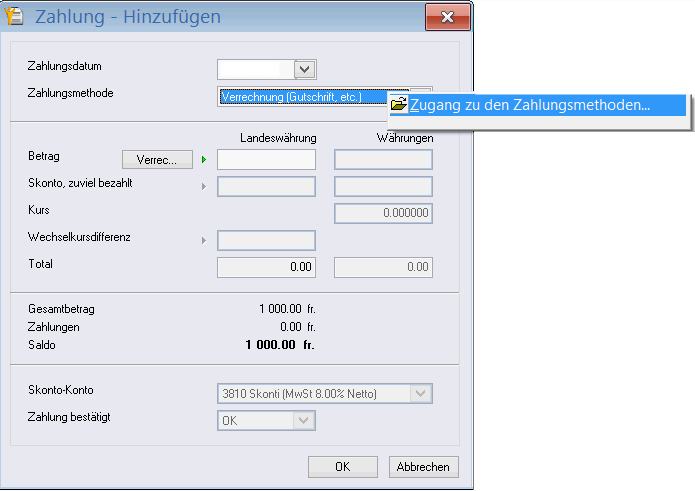 *Wenn diese Zahlungsmethode nicht existiert, können Sie sie durch einen rechten Mausklick auf Zahlungsmethode und Zu den Zahlungsmethoden (Art: Verrechnung) erstellen.