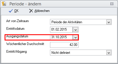 - Öffnen Sie die bestehende Periode und ändern Sie das Austrittsdatum (Ende des Monats, in dem der Lohnempfänger seinen 65. Geburtstag feiert, z.B.: wenn der Lohnempfänger am 12. Oktober geboren wurde, ist das Ende der Periode der 31. Oktober).