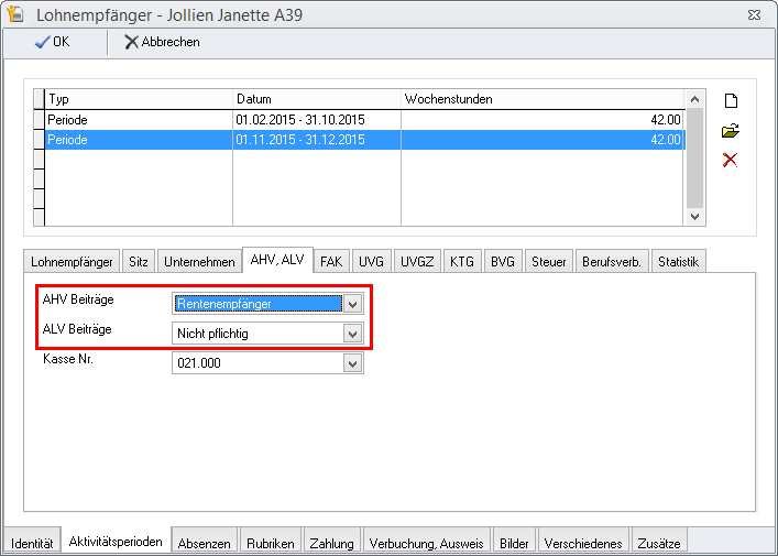 - In der Registerkarte AHV, ALV wählen Sie "Rentenempfänger" unter AHV-Beitrag und "Nicht Phlichtig" unter ALV-Beitrag