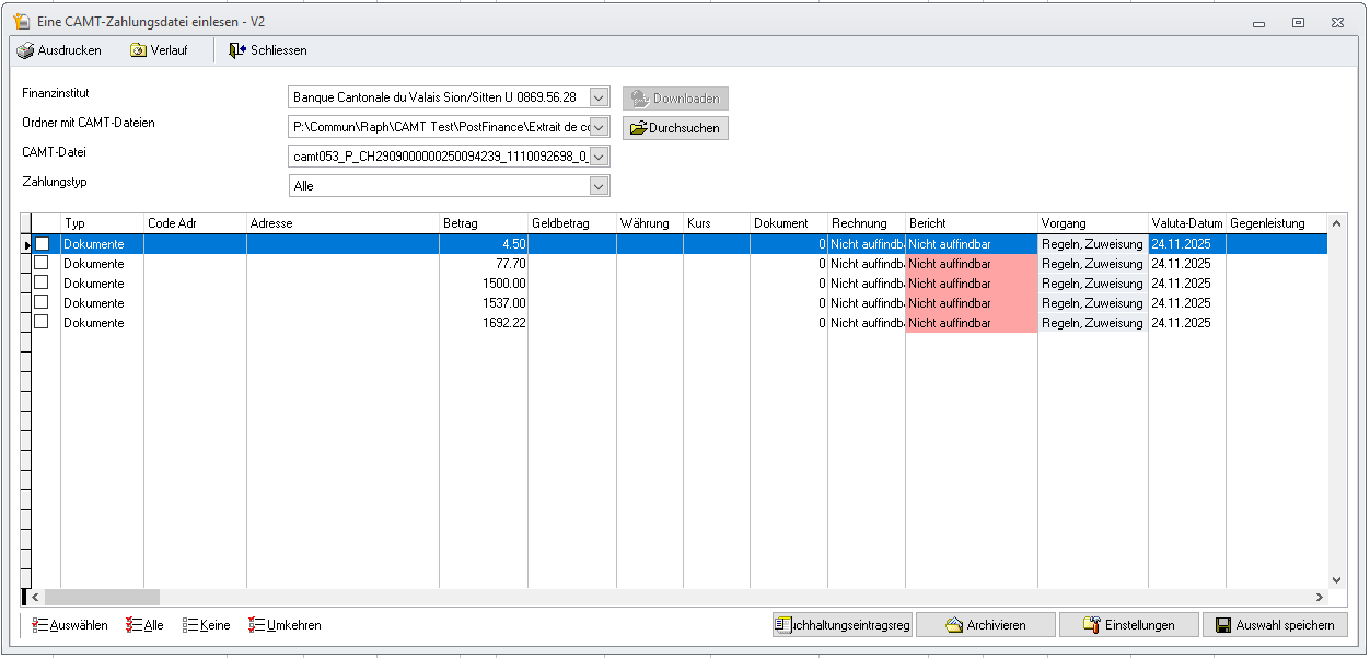Die Verwaltung der CAMT-Dateien ist nun in einem einzigen Fenster zentralisiert, das über die Module Löhne, Handel oder direkt über das Menü Buchhaltung – Buchungen zugänglich ist.