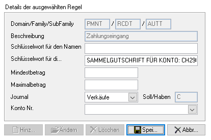 CAMT-Dateien enthalten standardisierte Informationen (Transaktionscode und -typ, Soll/Haben, Name, Mitteilung, Betrag, Datum, Journal usw.). Beim Einlesen ruft Winbiz diese Daten automatisch ab, um das Formular zur Regelerstellung entsprechend den von Ihrem Finanzinstitut übermittelten Informationen vorab auszufüllen.