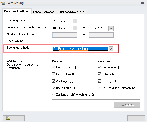 5. Legen Sie die Bruttobuchungsmodi fest und aktualisieren Sie diese auf vorhandenen Dokumenten.