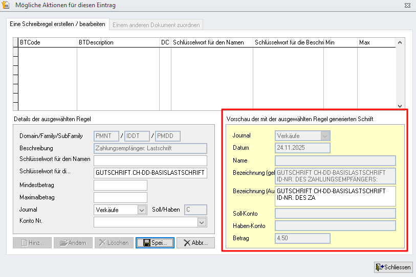 Für alle Zeilen, die nicht mit einem Dokument in der Buchhaltungsdatei verknüpft sind, bietet Winbiz die Möglichkeit, Regeln zu erstellen, um die Erfassung der Buchungen in der Hauptbuchhaltung zu automatisieren.