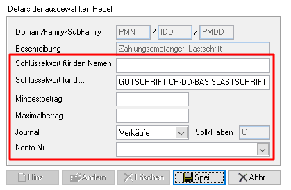 CAMT-Dateien enthalten standardisierte Informationen (Transaktionscode und -typ, Soll/Haben, Name, Mitteilung, Betrag, Datum, Journal usw.). Beim Einlesen ruft Winbiz diese Daten automatisch ab, um das Formular zur Regelerstellung entsprechend den von Ihrem Finanzinstitut übermittelten Informationen vorab auszufüllen.