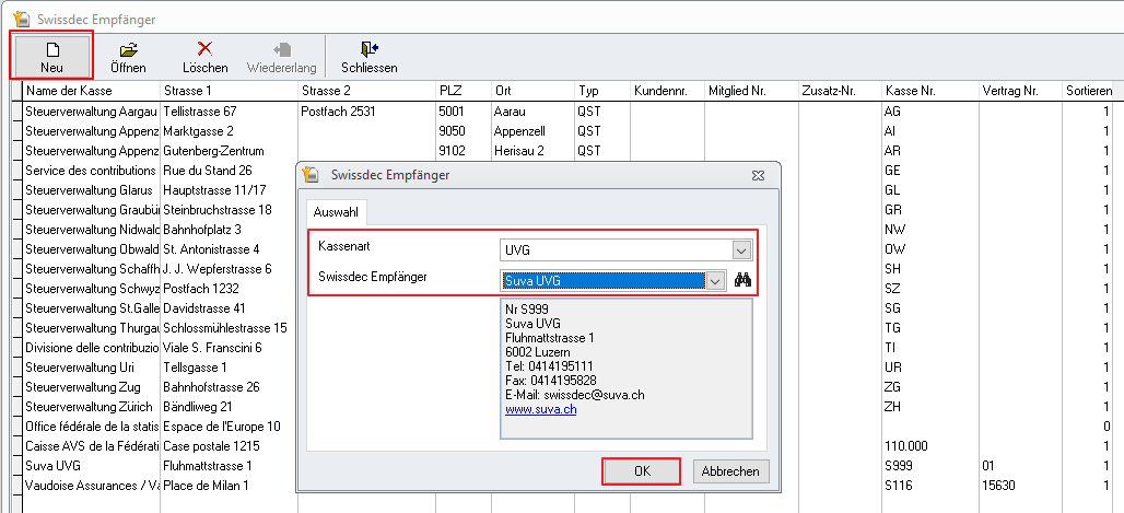 Es ist durchaus möglich, die UVG-Kasse SUVA über die Schaltfläche Neu zu erstellen.