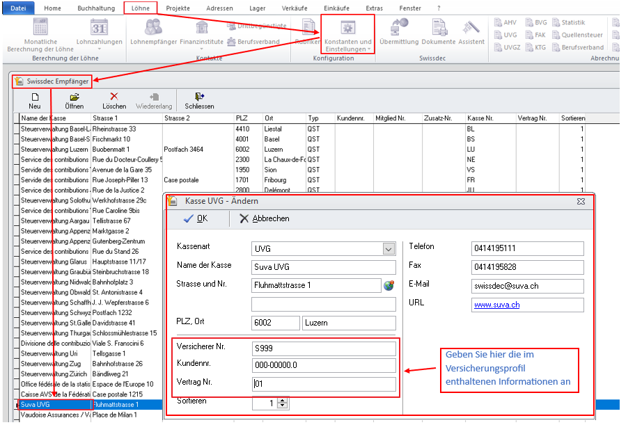Die Swissdec-Empfänger sind im Modul Lohnbuchhaltung zugänglich, dann unter Konstanten und Einstellungen, schliesslich Swissdec-Empfänger.