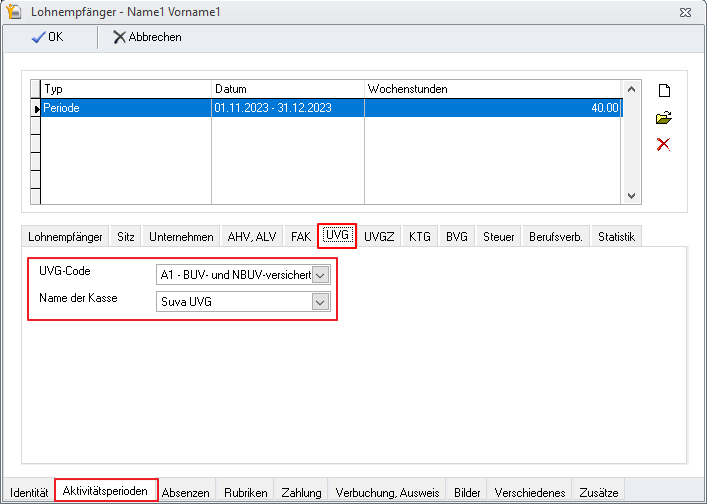 Dieser UVG-Code und die SUVA-Kasse sind in der Konfiguration Ihrer Mitarbeiter unter Mitarbeiter, Aktivitätsperioden und dann UVG zu übertragen. Um dies für alle Mitarbeiter auf einmal zu tun, verwenden Sie den Assistenten: unter Menü Lohn - Swissdec - Assistent.