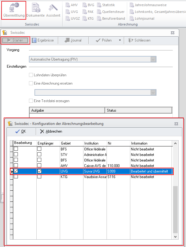Sobald die Lohnempfänger eingerichtet und die Löhne berechnet sind, z.B. am Ende des Jahres, muss die UVG-Abrechnung via Swissdec an die SUVA übermittelt werden.