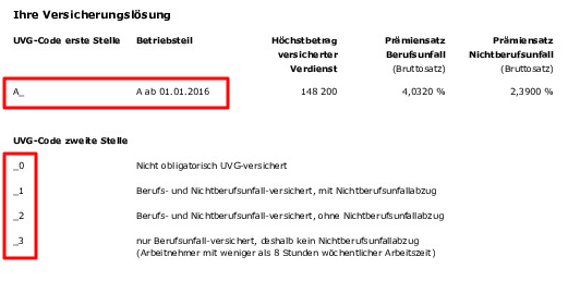 Es ist notwendig, die Mitarbeiter einzurichten, um ihnen die SUVA-Kasse und den entsprechenden Code zuzuweisen. Diese Information wird in Ihrem UVG-Versicherungsprofil gemäss untenstehenden Angaben angegeben.