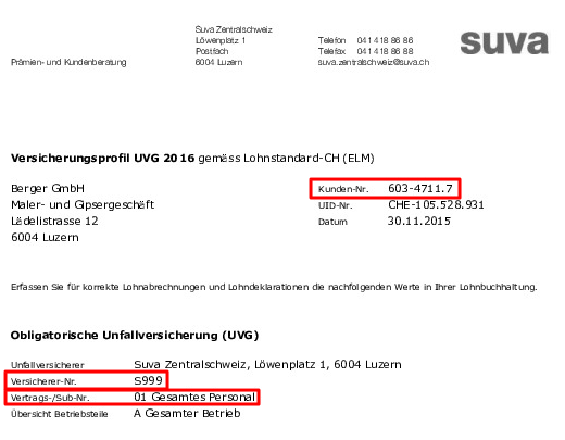 Die SUVA teilt Ihnen Ihr UVG-Versicherungsprofil per Post mit, in der Regel am Ende des Jahres. Dieses Dokument enthält mehrere Informationen, die Sie in Ihre Winbiz Cloud Software implementieren müssen: