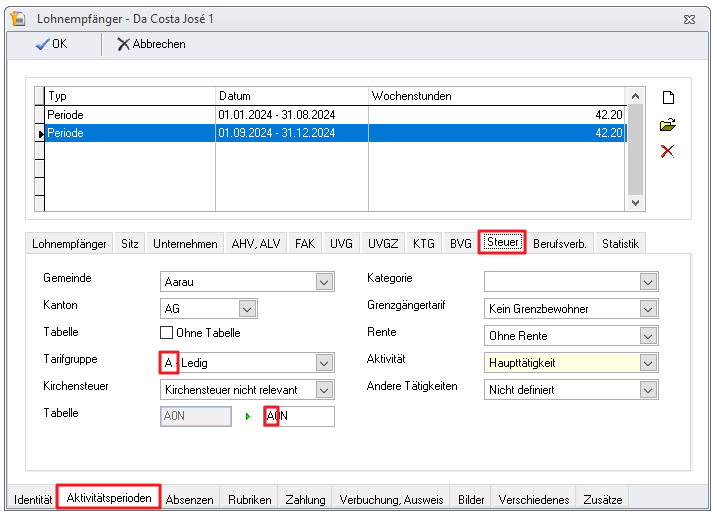 - Beispiel: Wenn der Arbeitnehmer am 15. September geheiratet hat, ist die Manipulation auf dem Septemberlohn vorzunehmen. In der Aktivitätsperiode muss der 1. des Monats angegeben werden, auch wenn die Änderung am 15. des Monats erfolgt ist.