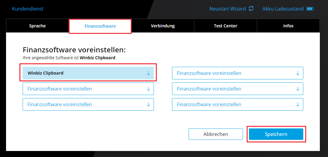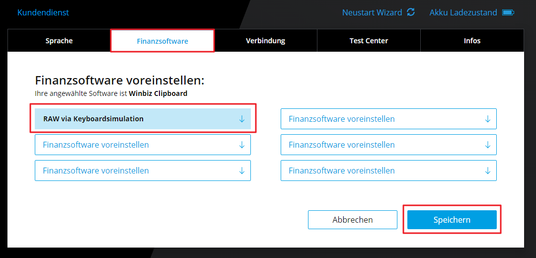 Öffnen Sie die Payeye-Software erneut und wählen Sie auf der Registerkarte Finanzsoftware Winbiz Clipboard auf dem PC oder RAW via Keyboardsimulation auf dem Mac.