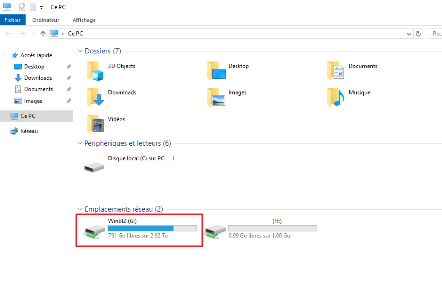 Le fenêtre avec l'emplacement de votre base de données s'ouvre. Seulement le disque local C: sera visible depuis l'explorateur de Winbiz Cloud en plus de "WinBIZ (G:)" et "Nom d'utilisateur Winbiz Cloud (H:).