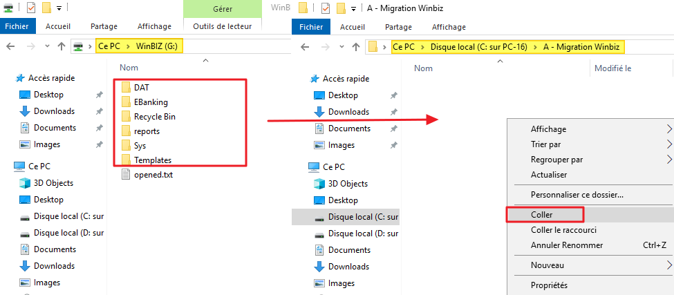 Sous WinBIZ (G:), sélectionnez les dossiers suivants afin de la copier le sur le disque local (C:)".