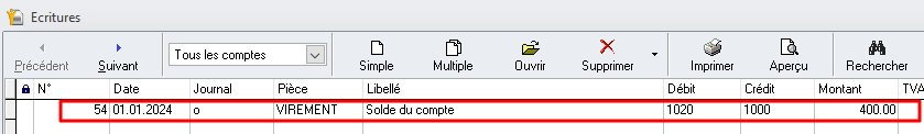 Nouvelle écriture créée automatiquement sur le nouvel exercice après le bouclement :