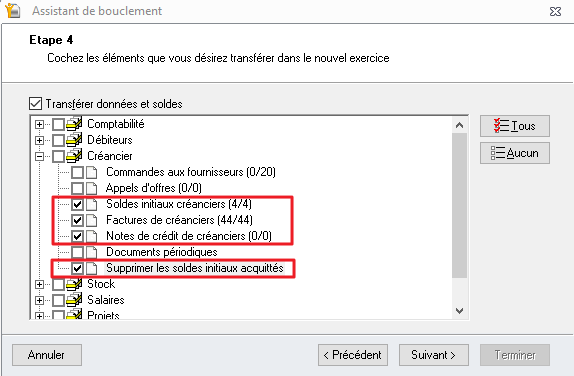- A l'étape 4, cochez "Supprimer les soldes initiaux acquittés" sous la rubrique Débiteurs ou Créancier, "Soldes initiaux", "Factures" et "Notes de crédit".