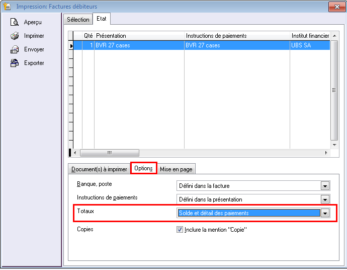 3. Dans la partie Totaux : choisissez Solde et détail des paiements.
