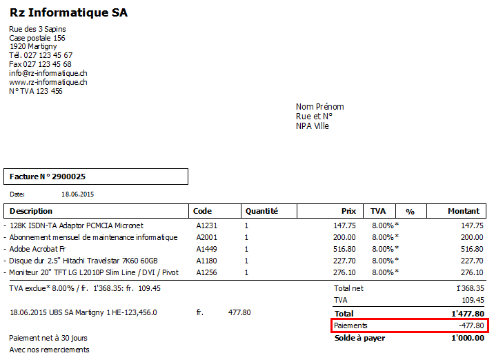 Afin qu'à l'aperçu de votre facture, le paiement soit déduit du montant total :
