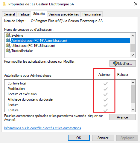 - Dans l’onglet Sécurité, vérifiez que tous les utilisateurs aient le contrôle total sur ce dossier.
