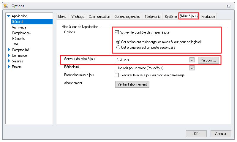 - Si l'onglet Mise à jour est grisé au menu Outils - Options, consultez l'article suivant : Pourquoi l'onglet Mise à jour est grisé au menu Outils - Options ?).