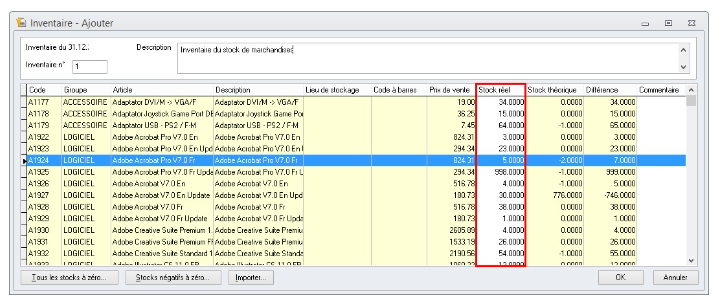 - Dans la grille des articles, saisissez les quantités précédemment comptées dans la colonne Stock réél.