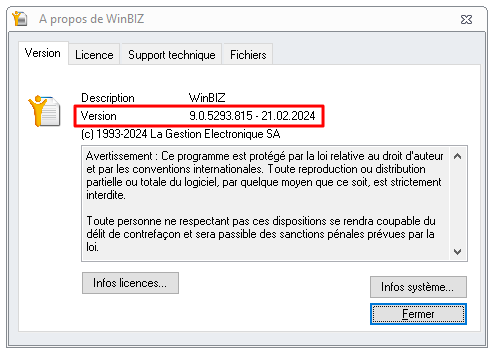 - Dans l'onglet Version, vous trouverez le numéro ainsi que la date de la version utilisée.