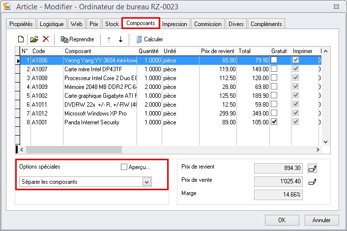 - Dans l'onglet Composants, sélectionner l’option spéciale « Séparer les composants ».