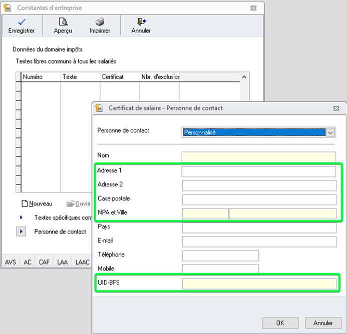 Les paramétrages pour la personne de contact, lors du choix de personnalisé, sur les certificats de salaire, des champs complémentaires ont été ajoutés.