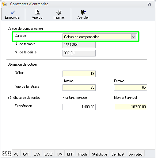 Il faut sélectionner le nom des caisses sociales actives de la société pour chaque onglet