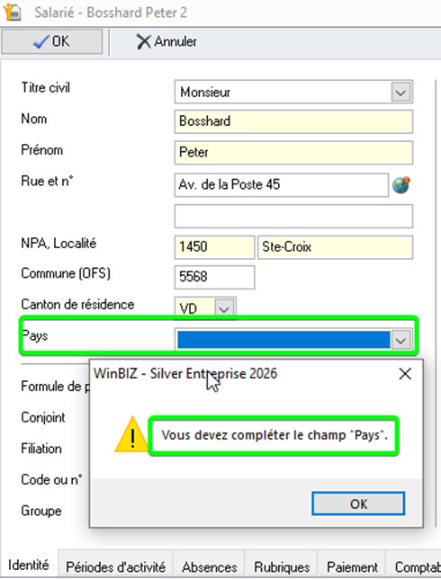 Lors de la création ou modification d’information d’un salarié, Winbiz contrôle avec la version ELM 5 les champs obligatoires qui ne sont pas remplis, lorsque vous fermer la fenêtre du salarié.