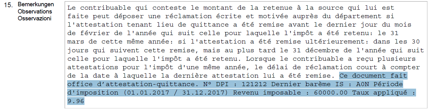 Une fois ces opérations effectuées, vous pourrez générer vos certificats de salaires (au menu Salaires, Swissdec, Documents) avec des indications correctes :