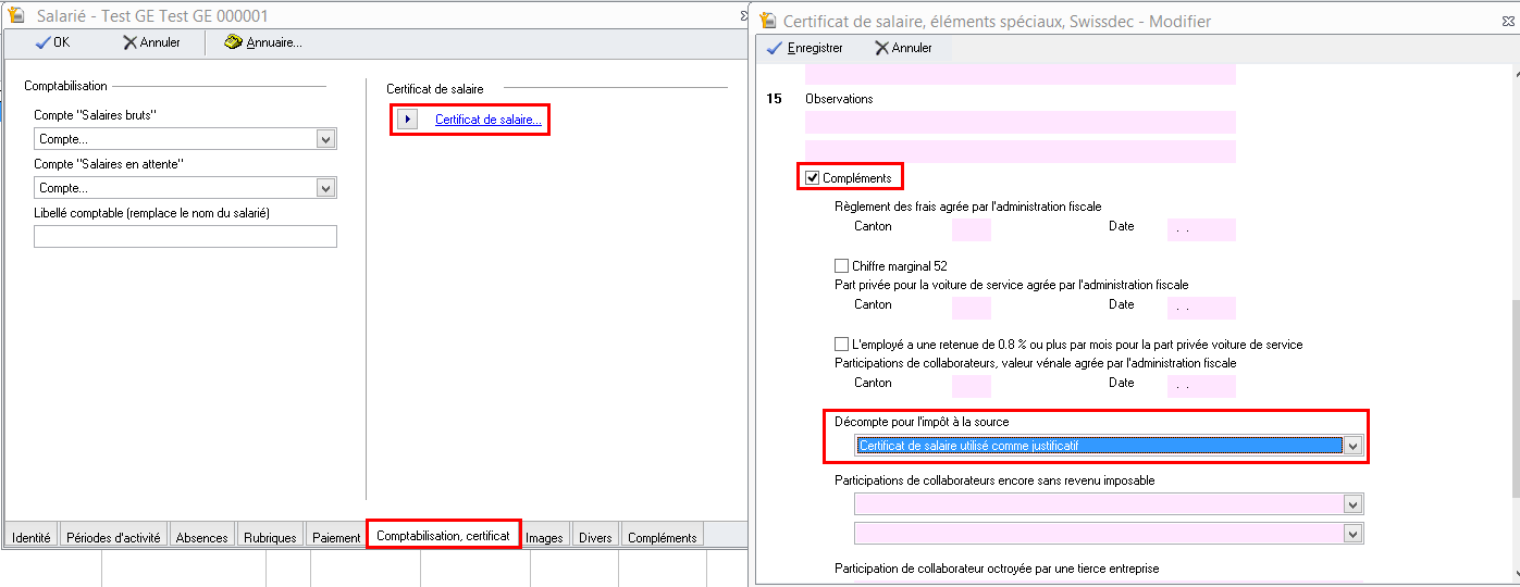 1. Indiquer au menu Salaires, Salariés, onglet Comptabilisation / Certificat, Certificat de salaire…, Compléments dans la partie Décompte pour l’impôt à la source que le certificat de salaire est utilisé comme justificatif pour tous les salariés concernés.