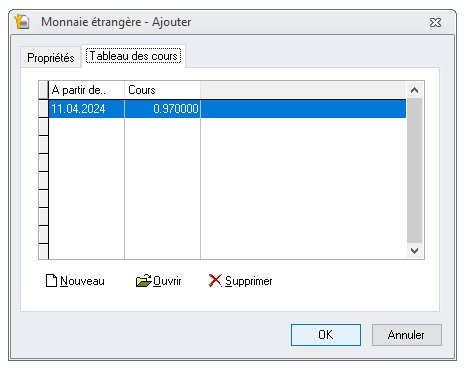 Le tableau des cours vous permet d'entrer les différents taux de conversion à différentes dates. Ces taux sont proposés automatiquement lors de la création d'écritures ou de documents impliquant cette monnaie.