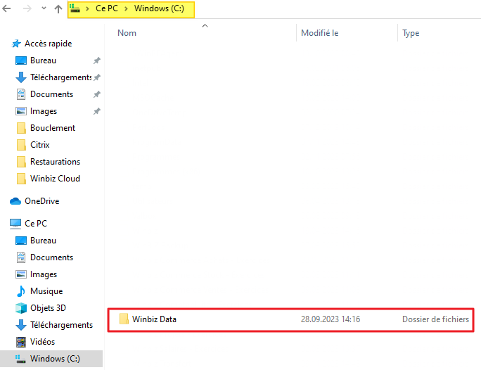 Pour commencer, le dossier contenant vos données s'appelle Winbiz Data. Il faut d'abord s'assurer que votre dossier "Winbiz Data" était enregistré sur le disque local C:.