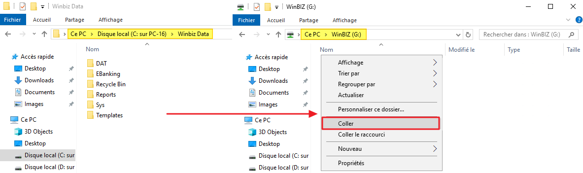 Sous Winbiz (C:), sélectionnez le dossier Winbiz Data et copiez le sur "WinBIZ (G:)".